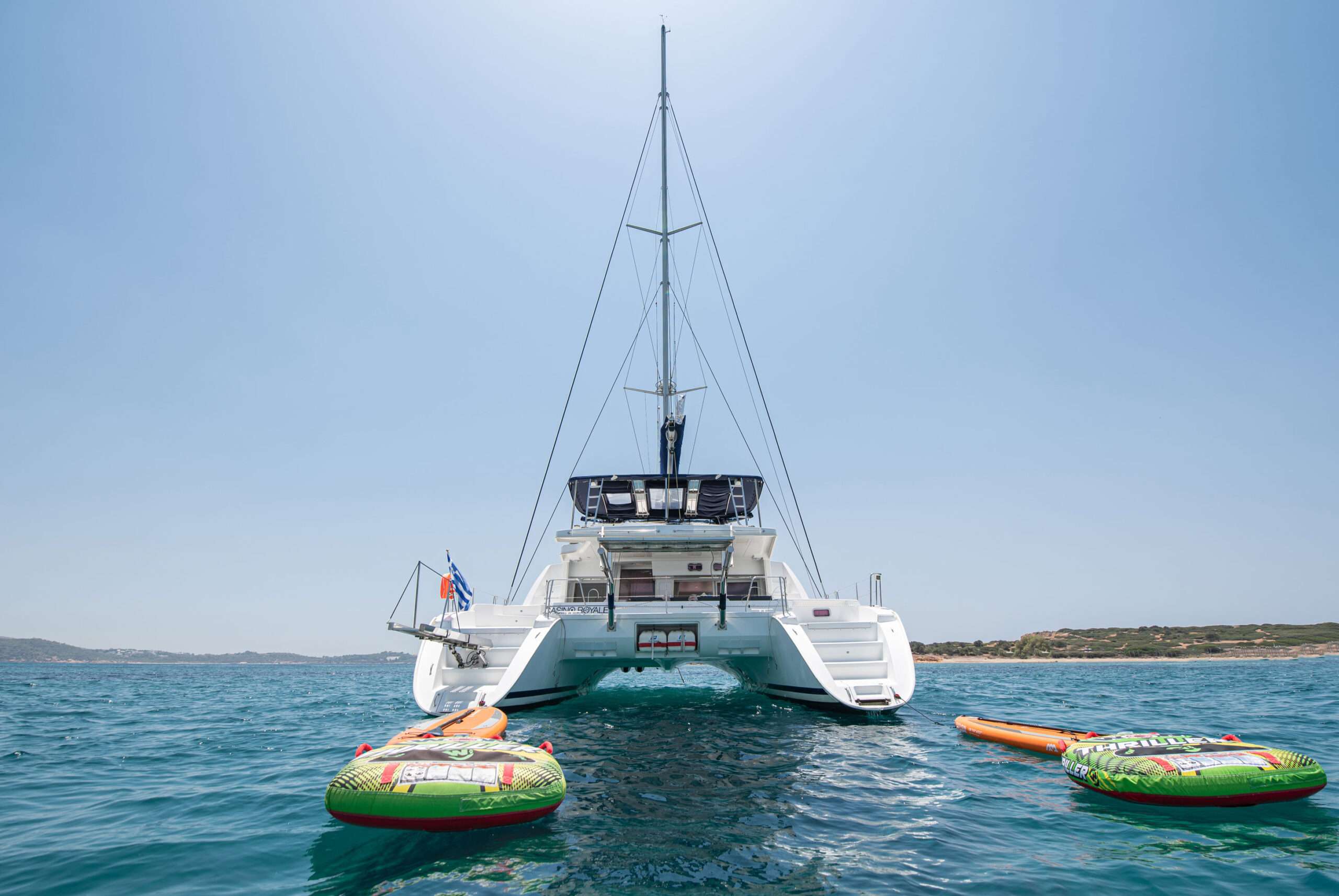 ‘Casino Royale’ is one of the biggest catamarans in 50 feet. She is a Lagoon 500, with the superior extra of a flybridge, that creates a great area to relax, along with your captain while sailing. The L500 practically created 3 different spaces for the guests to relax, these would be the cockpit, the forward saloon, and the flybridge. Equipped for a skippered charter with all the amenities of a floating hotel, including air conditioning, generator, solar panels, comfortable cockpit cushions, sunbeds, electric heads, USB sockets in all cabins and saloon, 3 refrigerators, and many additional amenities you can see listed below, surely she will offer you a great vacation experience.